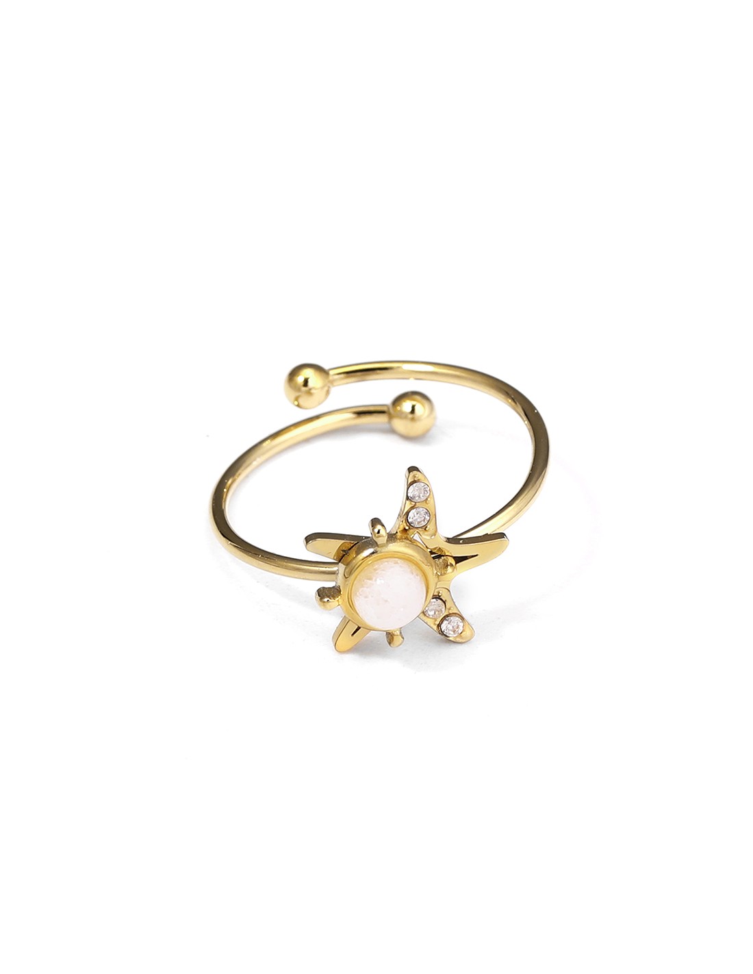 Anillo dorado de diseño abierto adornado con una estrella de mar decorada con circonitas brillantes y una piedra central. Su estructura ajustable lo hace cómodo y versátil, perfecto para añadir un toque marino y delicado a cualquier look. Ideal para amantes del estilo fresco y veraniego.
