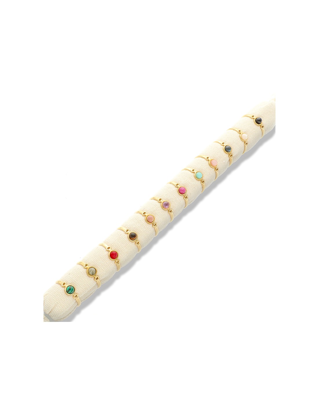Anillos abiertos en color dorado, decorados con una piedra natural redonda como protagonista, enmarcada por dos delicadas bolitas decorativas. Cada anillo presenta una piedra distinta en tonos vibrantes como verde esmeralda, rosa, rojo coral, turquesa, negro y más. Ideales para quienes buscan un toque de color con un diseño sofisticado y minimalista. Perfectos para ventas al por mayor, colecciones de bisutería artesanal o regalos con estilo.