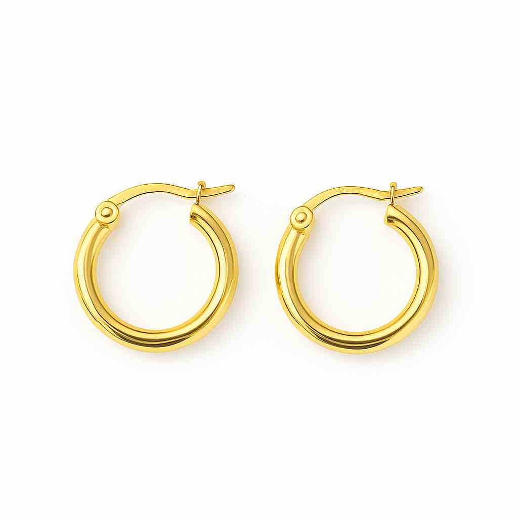 Aros pequeños de diseño clásico y cierre seguro tipo bisagra. Fabricados en acero inoxidable con acabado dorado brillante, ideales para el uso diario gracias a su resistencia y ligereza. Un básico versátil que no puede faltar en tu colección de accesorios.