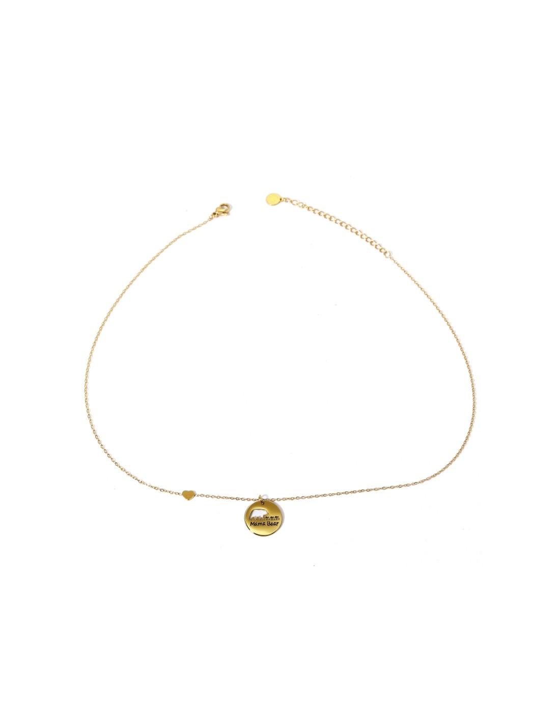 Cadena dorado minimalista con un diseño sencillo y elegante, compuesto por una cadena fina y una etiqueta colgante grabada de «Mama Bear» en el centro. La etiqueta, con un acabado pulido y grabado de osos en hueco, resalta por su simplicidad y estilo, creando una pieza sofisticada y personal que aporta un toque de elegancia discreta a cualquier look.
