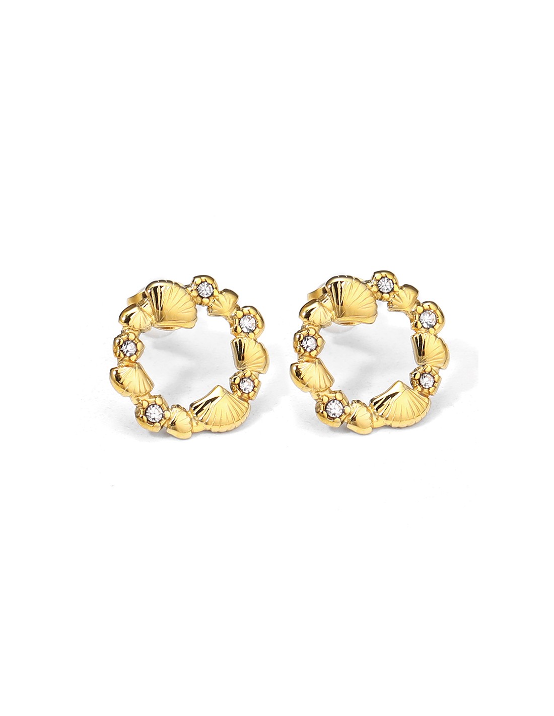 Pendientes dorados con un delicado aro central formado por vieiras y adornados con brillantes circonitas. Su diseño minimalista y sofisticado la convierte en una pieza versátil, ideal para el uso diario o como complemento para ocasiones especiales.