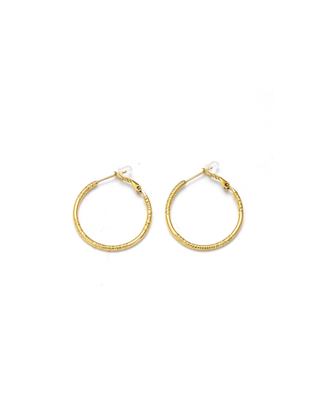 Elegantes pendientes de aro con un diseño texturizado en patrones diferentes grabadas en la superficie. Su acabado y cierre seguro los hacen ideales para un look sofisticado y moderno.